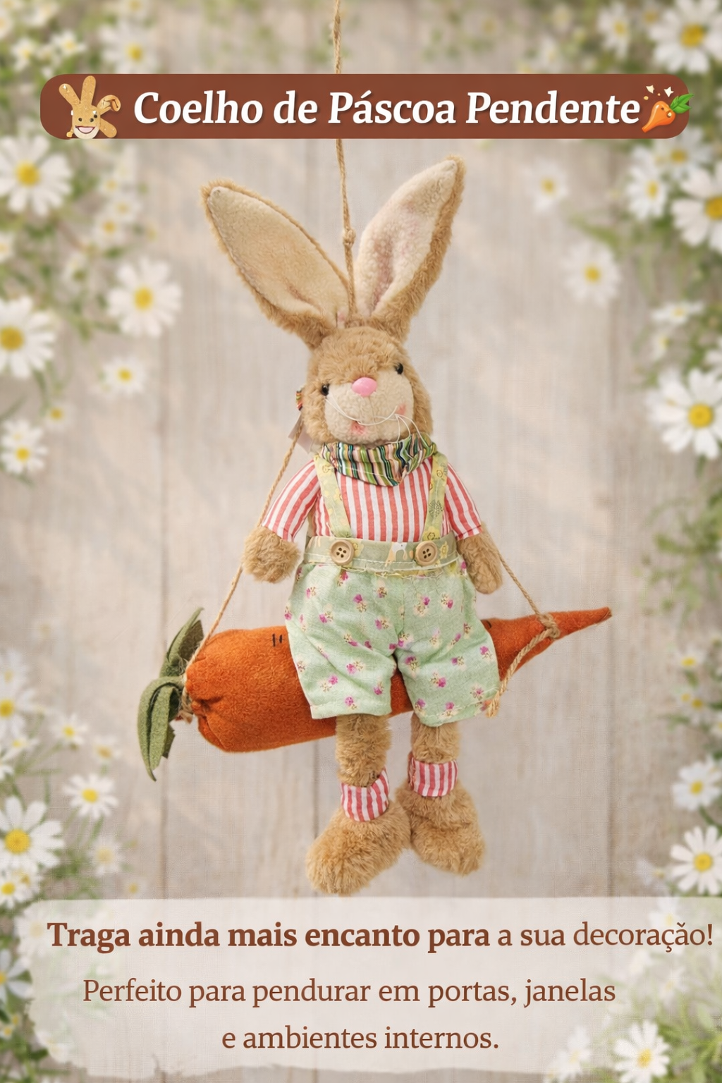 Encante sua decoração com esse lindo Coelho de Páscoa pendente! Com acabamento delicado, roupinha em tons suaves e apoiado em uma charmosa cenoura, ele é perfeito para trazer alegria e um toque especial ao seu ambiente.