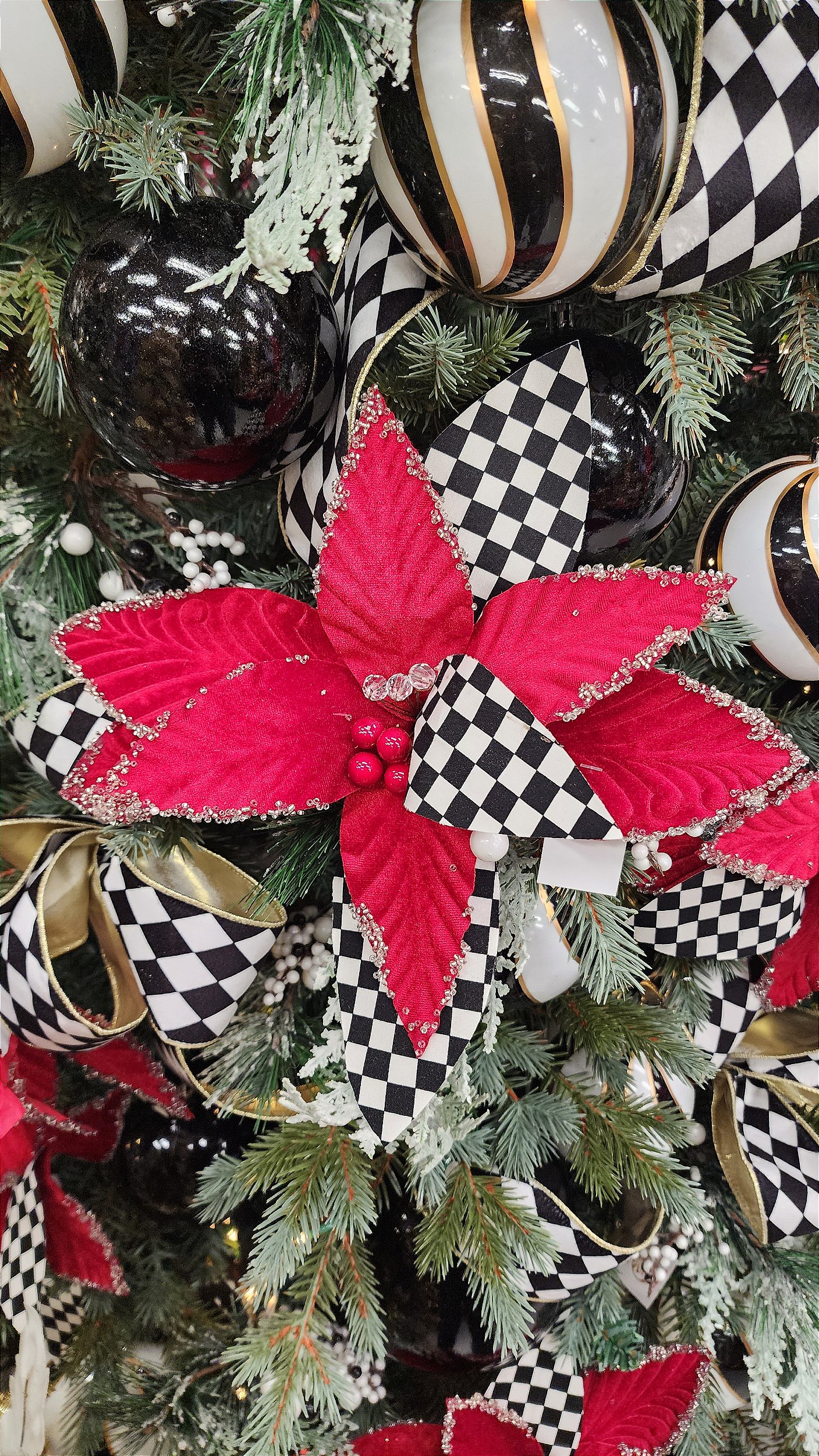 Flor vermelha e quadriculada em preto e branco.