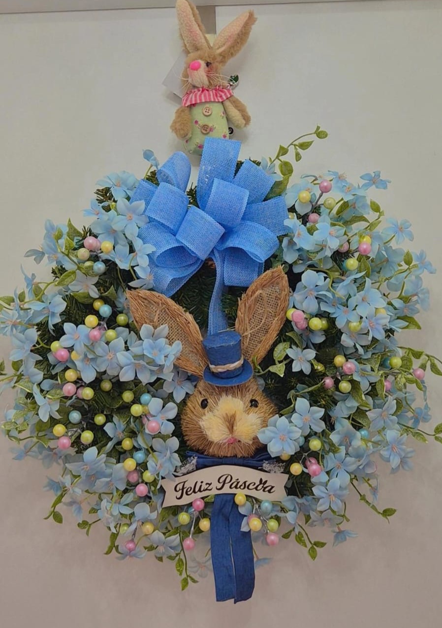 Deixe sua casa ainda mais charmosa nesta Páscoa com esta linda guirlanda artesanal! Com flores delicadas em tons de azul, detalhes coloridos e um coelhinho encantador, ela traz alegria, acolhimento e o verdadeiro espírito pascal para sua decoração.